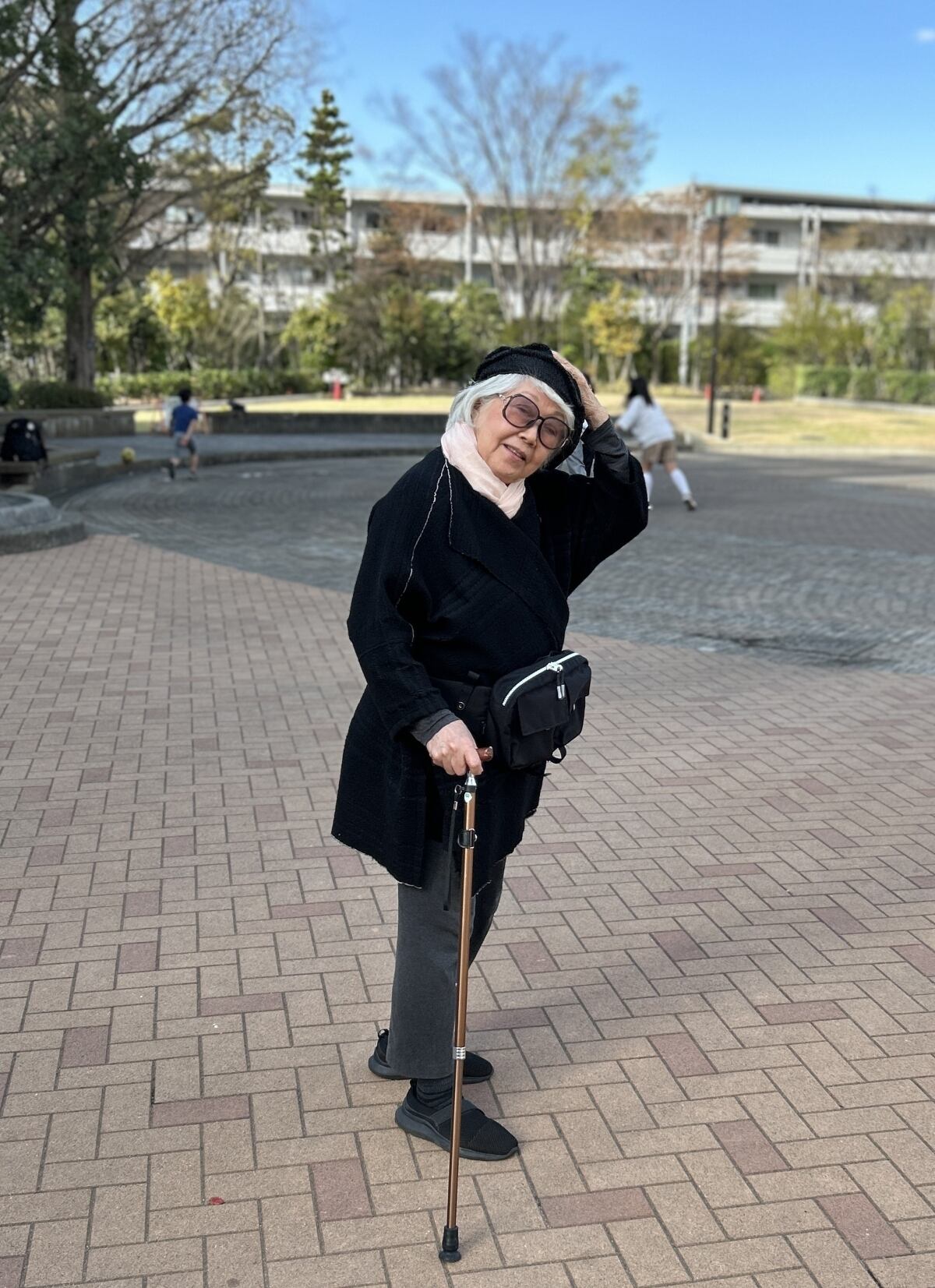 アクティブなシニアの方におすすめの、T字杖利用者向けウエストポーチです。