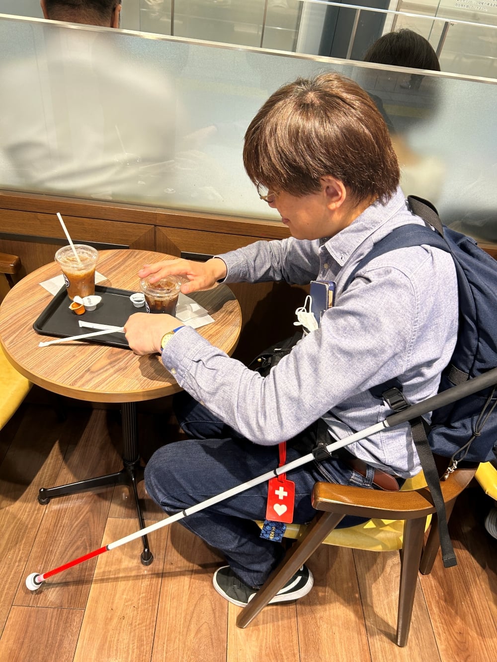 カフェで休憩。荷物置きのない狭い場所で白杖を保持。※椅子の高さや座る位置によっては使用しづらい場合もあります。