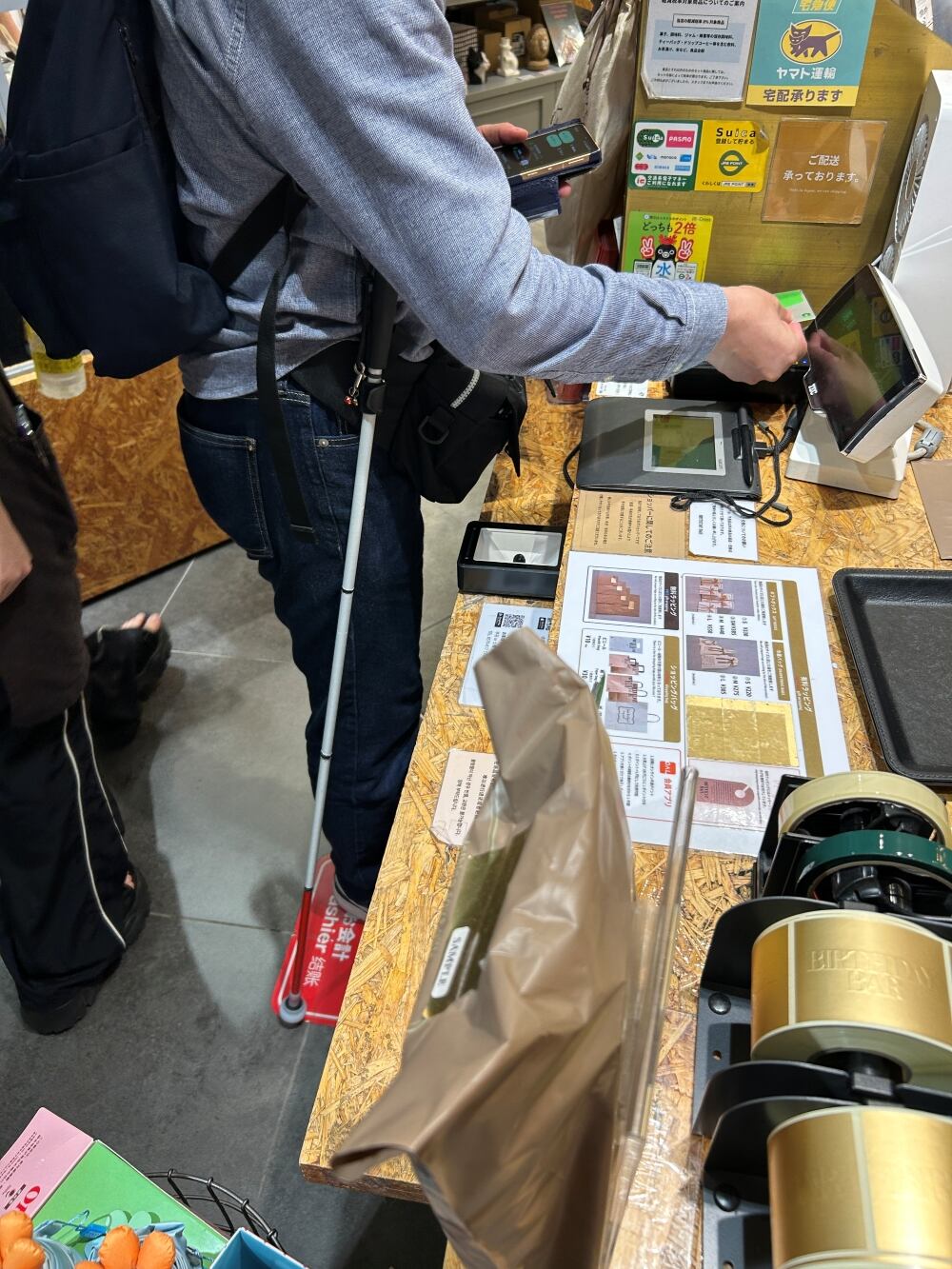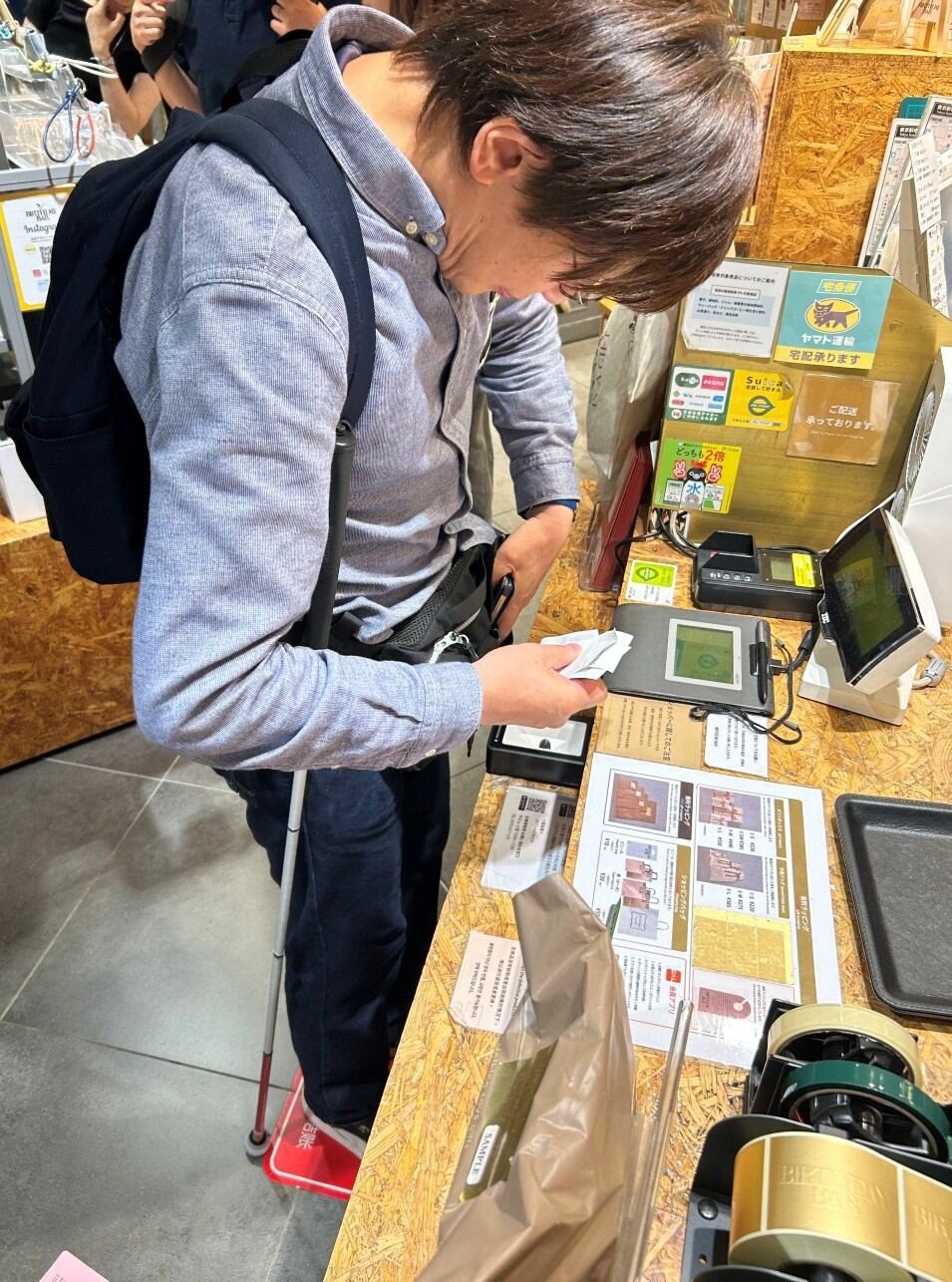 一方で、スマートフォンの操作や買い物など、両手を使いたい場面では、これまでどおり白杖を脇に挟む必要があり、手の動きが制限されてしまいます。外出先や日常生活の中には、両手を使わなければならない場面が少なくありません。例えば、買い物中に商品を手に取り、カバンから財布を出して会計する、改札でICカードを探す、駅でスマホの画面を確認しながら乗り換え情報をチェックする、飲料のキャップを回す、手を洗い、濡れた手をペーパーで拭く、傘を閉じてバンドを巻く、郵便受けから郵便物を取り出す、玄関の鍵を開け閉めする等……白杖を一時的に手から離したい状況は数多くあります。