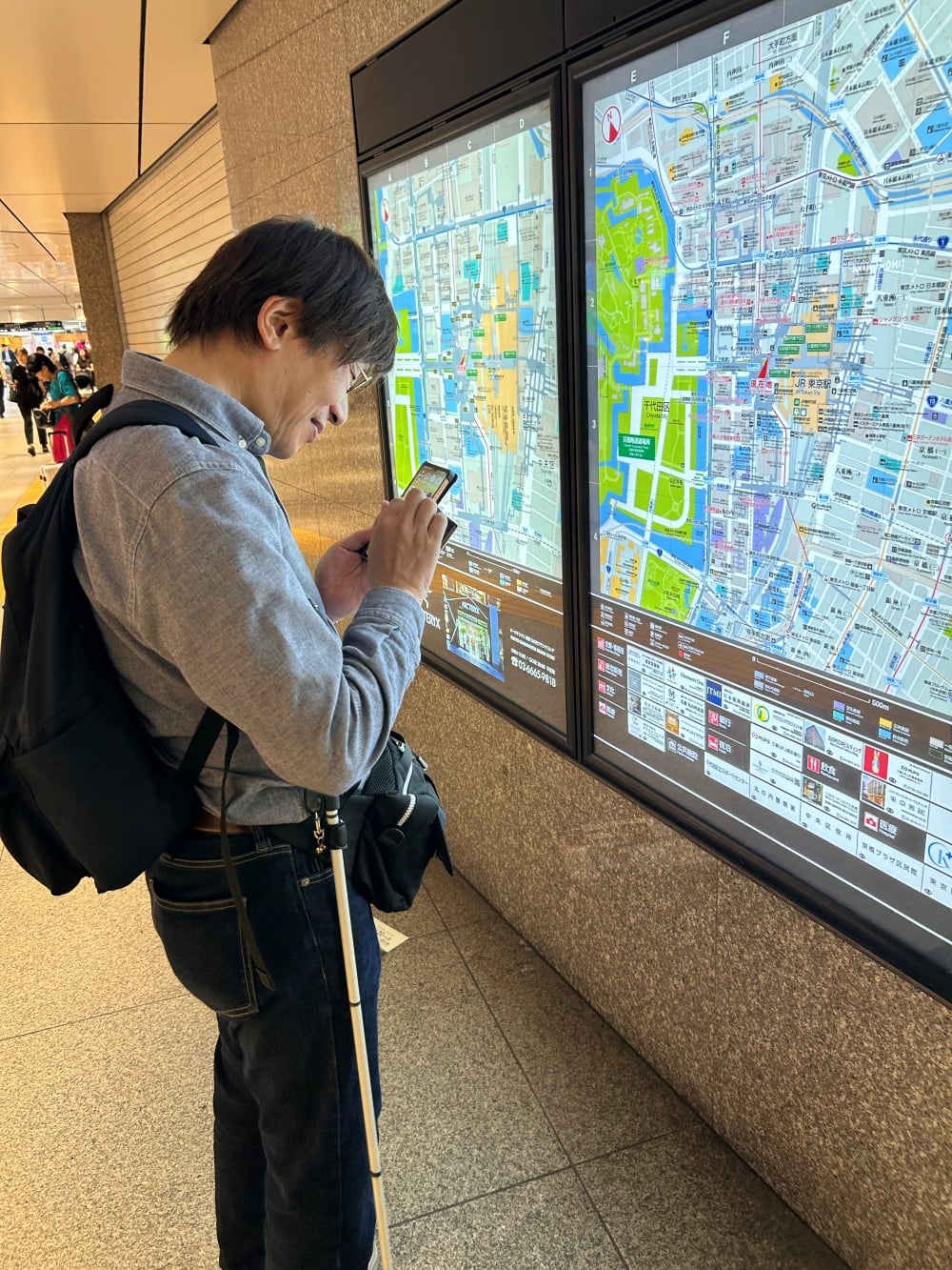 弱視の関根さまにモニターしていただきました。駅構内で、スマホを使い現在位置を確認。